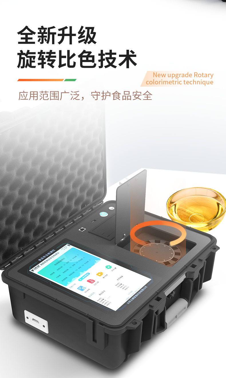 1、儀器采用手提一體化系統(tǒng)檢測(cè)技術(shù),將分光光度模塊、膠體金檢測(cè)模塊、新型農(nóng)殘檢測(cè)模塊、數(shù)字化管理模塊、無線通訊模塊高度集成于一體,支持檢測(cè)200種食品安全檢測(cè)項(xiàng)目,同時(shí)預(yù)留升級(jí)檢測(cè)方法。2、儀器檢測(cè)模塊標(biāo)準(zhǔn)化、智能化,檢測(cè)項(xiàng)目可隨意自由組合。檢測(cè)箱體內(nèi)置多個(gè)標(biāo)準(zhǔn)檢測(cè)單元,檢測(cè)模塊可以調(diào)整配置。3、顯示屏幕:儀器采用10.1英寸豎向液晶觸摸屏顯,搭配運(yùn)行安卓智能操作系統(tǒng),主控芯片采用ARM Cortex-A7,RK3288/4核處理器,主頻1.88Ghz,操作方便,性能更強(qiáng)。4、檢測(cè)通道:≥12通道;采用精密旋轉(zhuǎn)比色池設(shè)計(jì),使用同芯片同光源校準(zhǔn)精度,解決不同光源之間的誤差值,更加準(zhǔn)確**。(1-12通道間誤差0.1%,***:**202022821055.2)5、儀器光源:高精度進(jìn)口四波長(zhǎng)冷光源,每個(gè)通道均配置 410、520、590、630nm 波長(zhǎng)光源,標(biāo)配**的光路切換裝置,專利光路切換功能可實(shí)現(xiàn)64波長(zhǎng),并且所有檢測(cè)項(xiàng)目可實(shí)現(xiàn)所有通道同時(shí)檢測(cè)。6、設(shè)備可一鍵校準(zhǔn),自動(dòng)保存校準(zhǔn)數(shù)據(jù),自動(dòng)對(duì)比校驗(yàn),得到精準(zhǔn)光源,采用Android SP存儲(chǔ)數(shù)據(jù),光源數(shù)據(jù)永不丟失,方便每一次使用。7、通訊接口:配備無線通信模塊、4G(APN)通訊模塊、藍(lán)牙傳輸,同時(shí)具有雙USB接口以及RJ45網(wǎng)線接口,可以多方式實(shí)現(xiàn)數(shù)據(jù)保存及數(shù)據(jù)傳輸。8、存儲(chǔ)方式:支持U盤存儲(chǔ),標(biāo)準(zhǔn)USB接口,免驅(qū)動(dòng)安裝。檢測(cè)結(jié)果存儲(chǔ)容量20萬條以上,可生成Excel表格進(jìn)行拷貝,并具有登錄保護(hù)功能。9、智能化操作系統(tǒng):9.1、操作系統(tǒng):儀器可在同一檢測(cè)界面自動(dòng)對(duì)應(yīng)相關(guān)檢測(cè)通道,一次性選擇1-12個(gè)樣品名稱,無需退出界面,節(jié)省操作時(shí)間。并可以對(duì)每個(gè)通道屬性和樣品信息單獨(dú)進(jìn)行編輯,例如送檢單位、人員,檢測(cè)人員等,打印時(shí)勾選打印顯示。9.2、數(shù)據(jù)集成系統(tǒng):設(shè)備首頁自動(dòng)匯總分析檢測(cè)數(shù)據(jù),包含:周檢測(cè)數(shù)據(jù)、月檢測(cè)數(shù)據(jù),全部檢測(cè)總數(shù)量,包含檢測(cè)總數(shù),合格數(shù),不合格數(shù),以及相關(guān)柱形分析圖,各項(xiàng)檢測(cè)數(shù)據(jù)一目了然,無需電腦查詢,更加快捷直觀。9.3、數(shù)據(jù)庫系統(tǒng):十幾項(xiàng)數(shù)據(jù)庫分類管理儀器:包含項(xiàng)目類型、項(xiàng)目數(shù)據(jù)、檢測(cè)數(shù)據(jù)、歷史記錄、國(guó)標(biāo)信息、曲線信息、采樣信息、檢測(cè)信息、受檢信息、復(fù)核信息、圖表信息、光源校準(zhǔn)信息、打印樣式信息、樣品庫信息等等,數(shù)據(jù)庫之間互相協(xié)調(diào)聯(lián)動(dòng)保證數(shù)據(jù)的真實(shí)完整性。同時(shí)產(chǎn)品數(shù)據(jù)庫以及歷史檢測(cè)記錄支持一鍵檢索功能。9.4、限量規(guī)判系統(tǒng):具有限量查詢、添加物質(zhì)合規(guī)判定系統(tǒng)。檢測(cè)出結(jié)果后,系統(tǒng)自動(dòng)調(diào)用系統(tǒng)數(shù)據(jù)庫中相關(guān)國(guó)標(biāo)進(jìn)行比對(duì)判定,客觀顯示判定結(jié)果是否合格。9.5、項(xiàng)目預(yù)設(shè)系統(tǒng):儀器具有任務(wù)預(yù)設(shè)模塊,一鍵提前預(yù)設(shè),給出方便快捷的新檢測(cè)方案,每一個(gè)任務(wù)分別可以設(shè)置不同的樣品、批次、編號(hào)、來源、備注、抽樣信息、檢測(cè)信息、受檢信息、復(fù)核信息等更多信息。樣品送檢時(shí)一鍵調(diào)取保存信息,并可多次調(diào)取,大大提高檢測(cè)效率。9.6、數(shù)據(jù)監(jiān)管系統(tǒng):同步對(duì)接監(jiān)管平臺(tái),數(shù)據(jù)可局域網(wǎng)和互聯(lián)網(wǎng)數(shù)據(jù)上傳,檢測(cè)結(jié)果可直接傳至食品安全監(jiān)管平臺(tái)。進(jìn)行區(qū)域食品安全監(jiān)管及大數(shù)據(jù)分析處理與數(shù)據(jù)統(tǒng)計(jì),監(jiān)測(cè)區(qū)域食品安全長(zhǎng)短期動(dòng)態(tài)及問題預(yù)估、預(yù)警。9.7.1、全新打印系統(tǒng):內(nèi)置全新打印機(jī),新創(chuàng)自定義打印方式,可按需靈活勾選控制:產(chǎn)品合格證(國(guó)家農(nóng)業(yè)部標(biāo)準(zhǔn)要求),二維碼,抽樣信息、檢測(cè)信息,受檢信息、復(fù)核信息、抽樣日期、檢測(cè)日期等信息的打印。9.7.2、A4紙版本報(bào)告打印功能(可選配):設(shè)備擁有兩種結(jié)果展示方式,可以自動(dòng)生成A4打印模板和小票打印模板兩種樣式,可通過WiFi及網(wǎng)線等方式鏈接外置打印機(jī)可進(jìn)行打印。10、供電模式:儀器交直流兩用,直流12V供電,可連接車載電源,配6ah大容量充電鋰電池,電量可實(shí)時(shí)顯示,方便戶外流動(dòng)測(cè)試。11、膠體金檢測(cè)模塊:采用單通道CMOS成像處理技術(shù)及膠體金免疫層析技術(shù),可讀取膠體金卡數(shù)據(jù),自動(dòng)采集、處理分析,將檢測(cè)結(jié)果顯示,并可根據(jù)參考限值自動(dòng)判斷檢測(cè)結(jié)果,可檢測(cè)常見的獸藥殘留、生物毒素、抗生素、